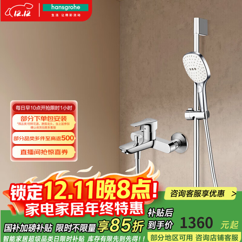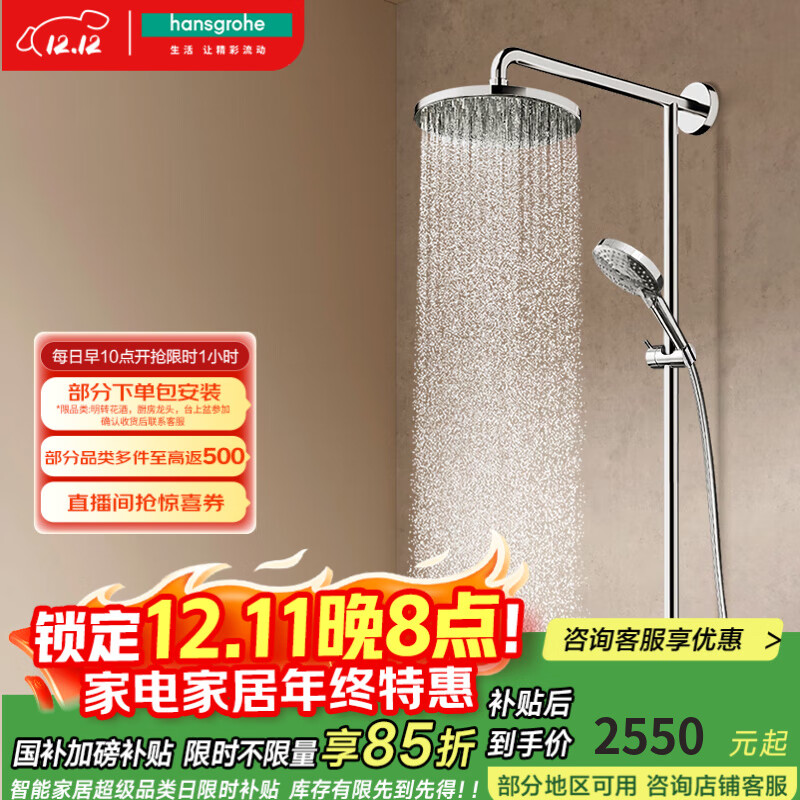 旗舰店汉斯格雅(Hansgrohe) 飞雨Select120淋浴花洒套装 方形手持+浴缸龙头71242