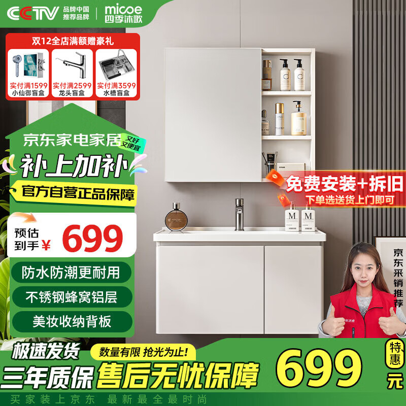 自营四季沐歌(MICOE)浴室柜不锈钢蜂窝铝美妆收纳陶瓷一体盆洗手池M-JL14(80)-PN镜柜