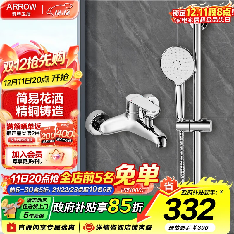旗舰店箭牌(ARROW)卫浴精铜龙头增压简易淋浴花洒套装电镀洗浴三档出水手持花洒全套 家居实用款AE3201M