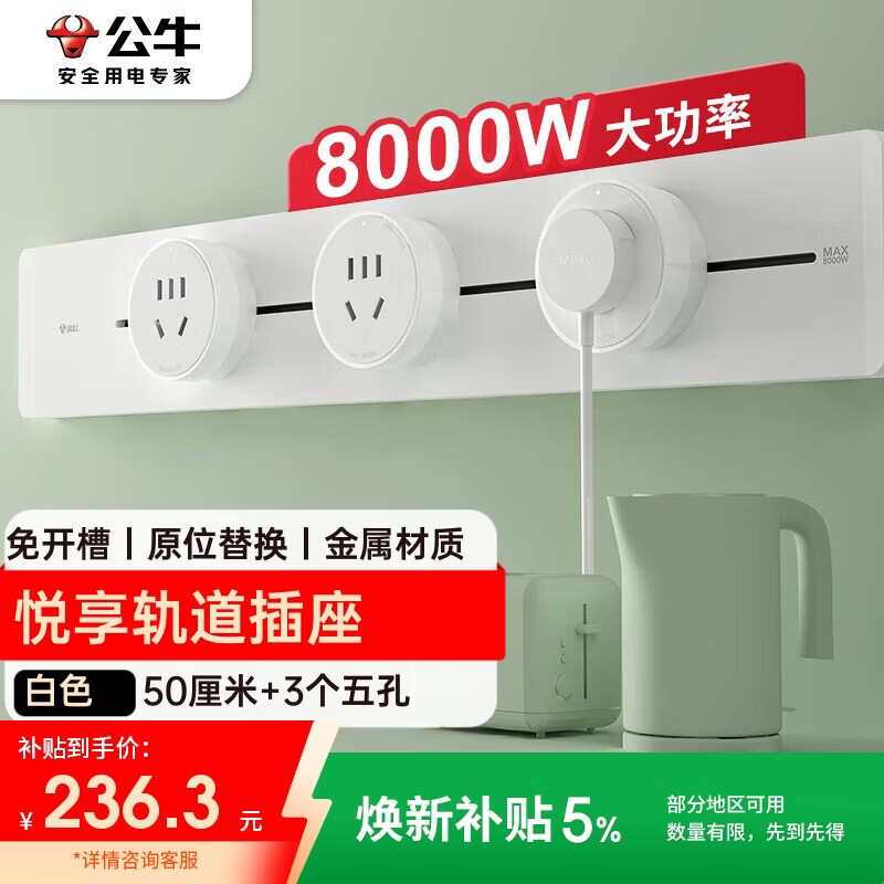 自营公牛(BULL)轨道插座可移动插线板轨道式导轨插排餐边柜 开关插座面板 悦享款gb32 50厘米+3个五孔白色