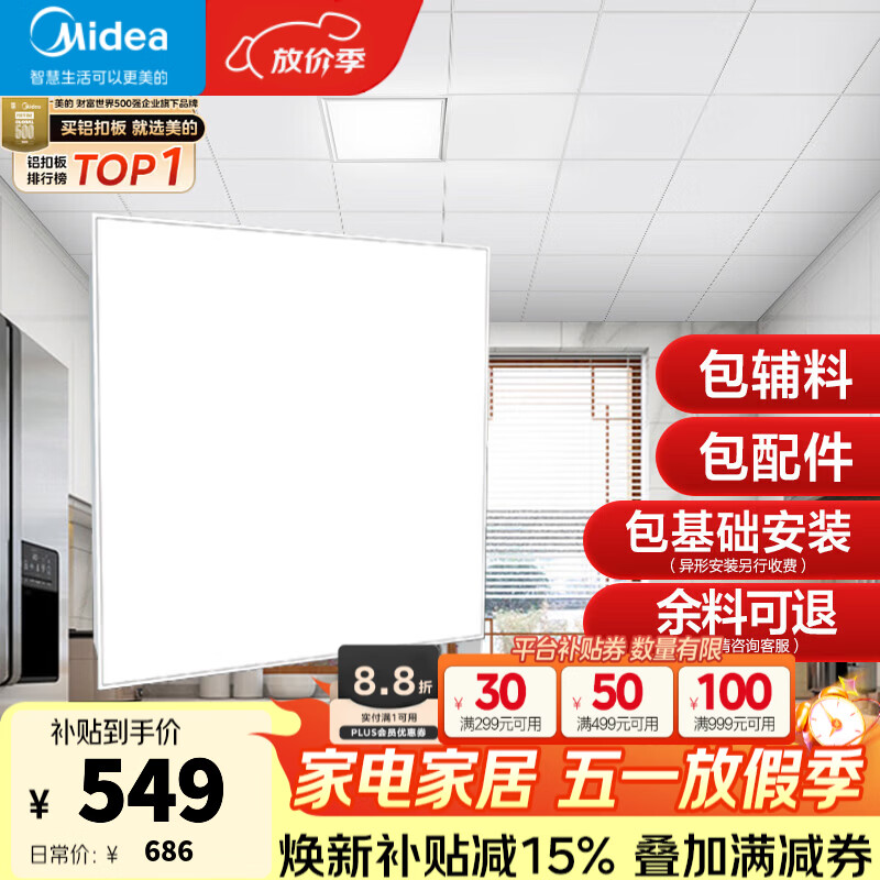 美的(Midea)铝扣板集成吊顶300*300卫生间厨房龙骨吊顶扣板材料全套免费送装 【4㎡-含辅料】30*30亚白