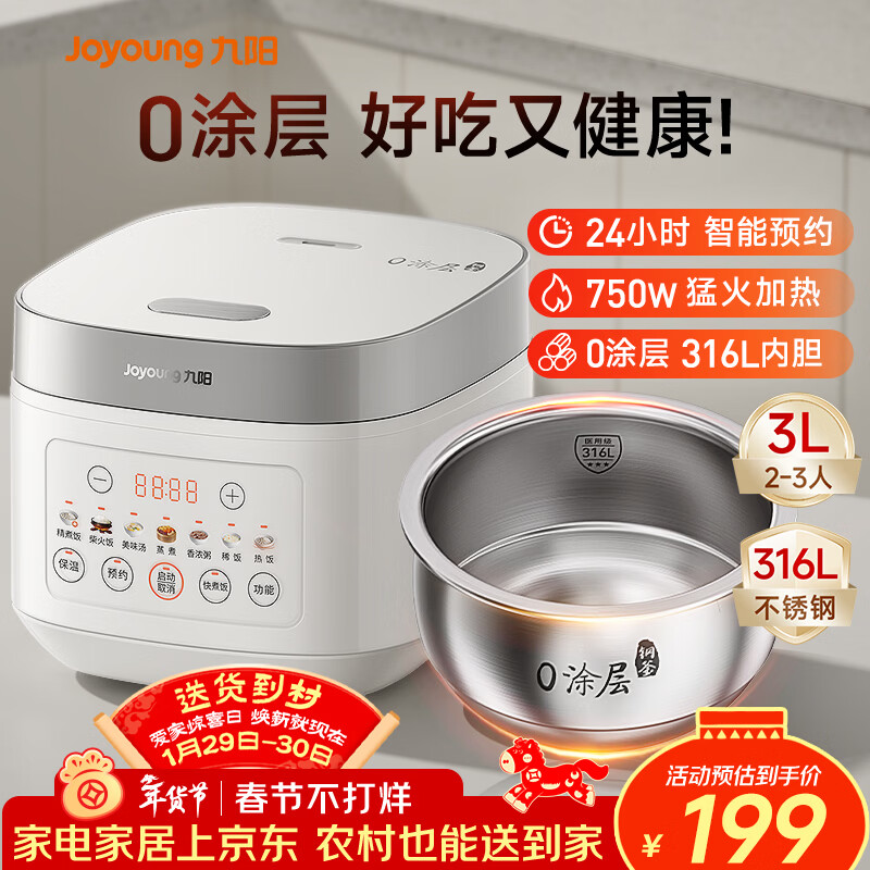 自营九阳(Joyoung)电饭煲3L家用电饭锅不锈钢内胆316L微压煮饭锅2-3人智能预约0涂层煲汤煮粥锅 F-30F335L