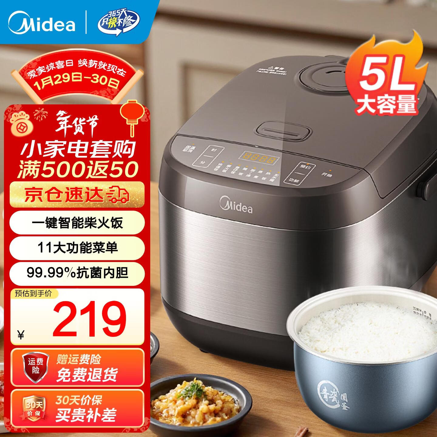 旗舰店美的(Midea)电饭煲电饭锅 家用2-4-5-8人大容量4升5升青瓷圆釜耐磨抗菌米饭锅多功能智能预约定时煮饭煮粥 【5L容量】第五代青瓷内胆 5L