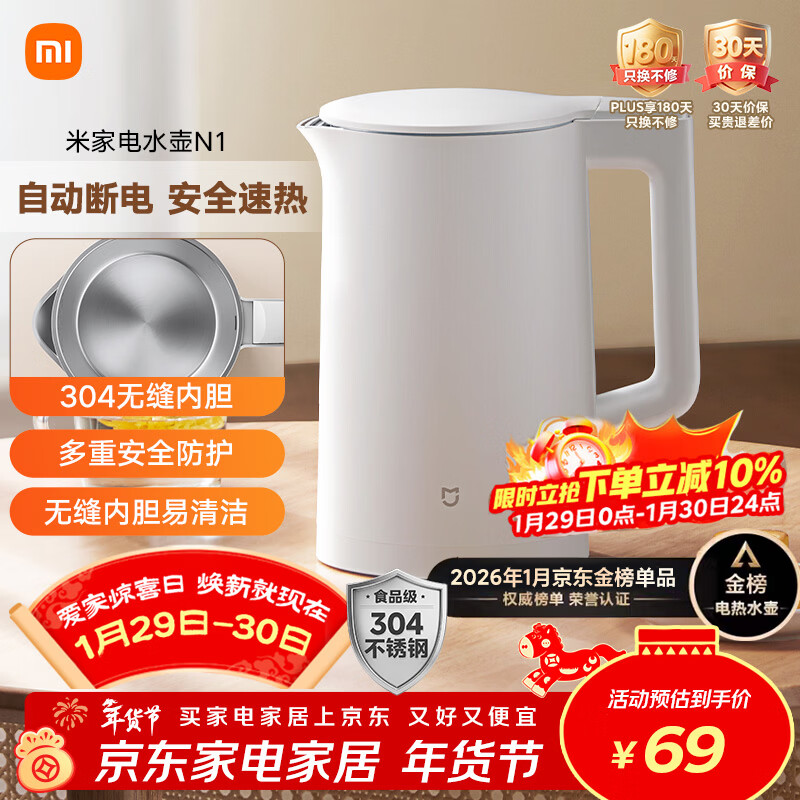 自营米家小米电热水壶N1烧水壶煮水壶家用 食品级304不锈钢 1500W快速加热 自动断电 1.5升大容量