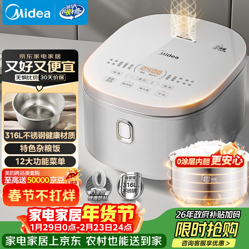 自营美的(Midea)电饭煲 0涂层电饭锅4升 316L不锈钢内胆3-4人家用多功能无涂层微压智能预约MB-RE476S