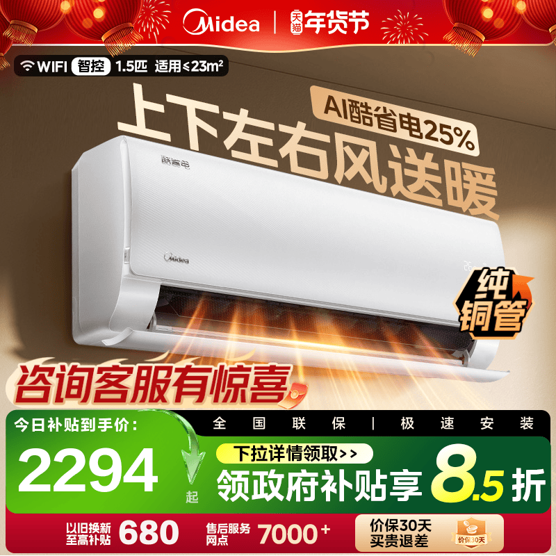 旗舰店美的空调酷省电新一级大1匹1.5匹节能变频冷暖两用家用卧室挂机KS
