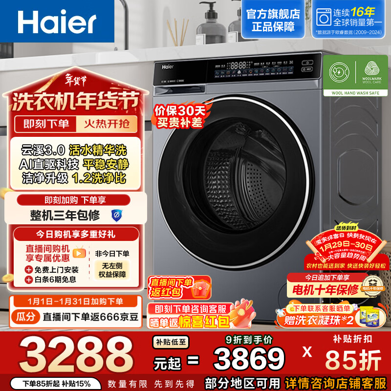 旗舰店海尔(Haier)云溪3.0单洗 滚筒懒人洗衣机家用全自动10kg大容量洗衣机 直驱精华洗 家电换新补贴 BLDE582HU1