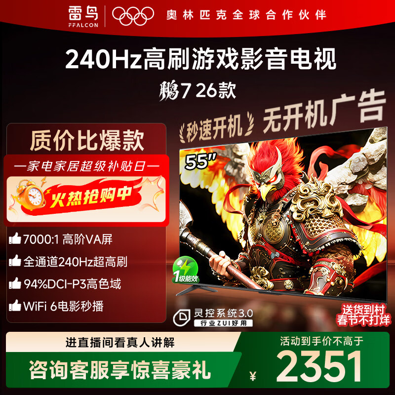 自营FFALCON雷鸟电视鹏7 26款 55英寸 高阶VA全通道240Hz高刷 HDMI2.1 94%P3色域 灵控系统电视机 55S78A
