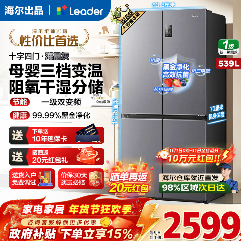 旗舰店海尔(Haier)冰箱出品539升统帅560四开门十字对开门双开大容量风冷无霜新一级能效变频Leader电冰箱 家电补贴 539升+阻氧干湿分储+黑金净化+一级节能