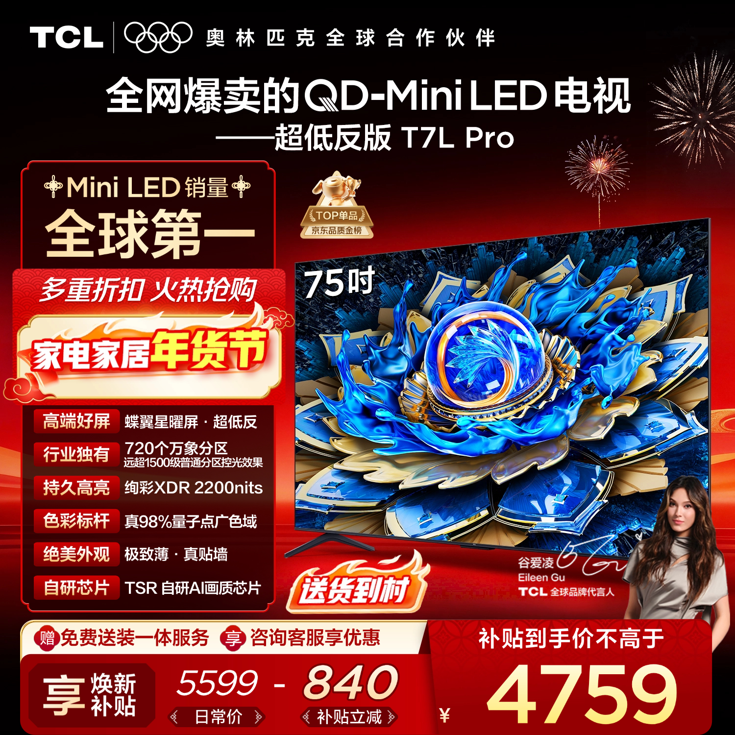 自营TCL电视 75T7L Pro 75英寸 QD-Mini LED 蝶翼星曜屏 万象分区 绚彩XDR 超薄 国家补贴