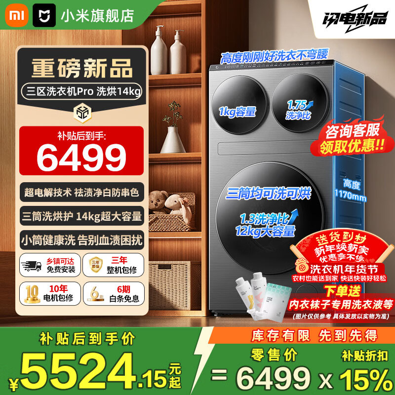 旗舰店小米(MI)米家【新品首发】14公斤大容量三筒洗洗烘一体超电解技术1.75高洗净比内衣袜子柔烘高温除菌洗衣机 14kg丨超电解技术丨四路独立投放 三筒