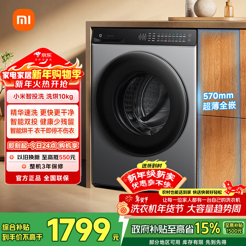自营米家【新年狂欢价】滚筒洗衣机全自动10公斤智投洗洗烘一体 一级能效羊毛洗国家补贴XHQG100MJ103