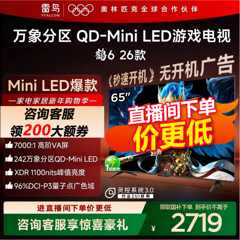 旗舰店FFALCON雷鸟电视鹤6 26款 65英寸万象分区QD-MiniLED1100nits 高阶VA安桥音响288Hz高刷 65英寸 平板电视 65英寸 国家补贴 65R69A