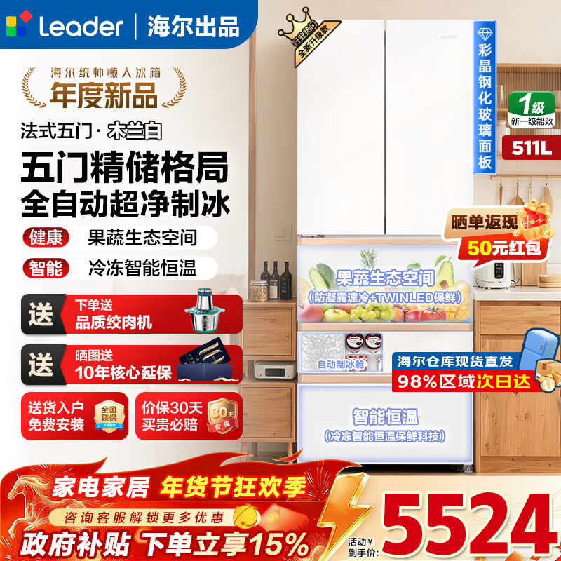 旗舰店海尔(Haier)冰箱出品511升木兰526日式五门法式多门自动制冰机彩晶面板EPP超净一级双变频果蔬保鲜大容量 511L+日系五门设计+全自动制冰+冷冻智能恒温