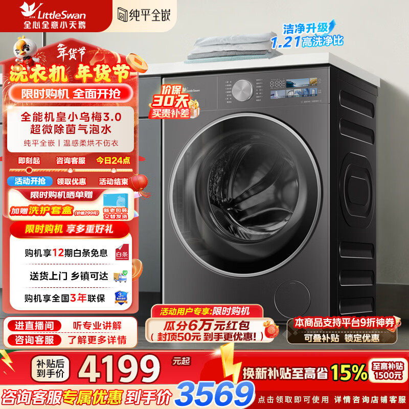 旗舰店小天鹅(LittleSwan)小乌梅3.0洗衣机滚筒全自动洗烘一体带烘干10公斤纯平全嵌大筒径超薄超微净泡水魔方补贴标准版 TD10VE40 洗烘一体