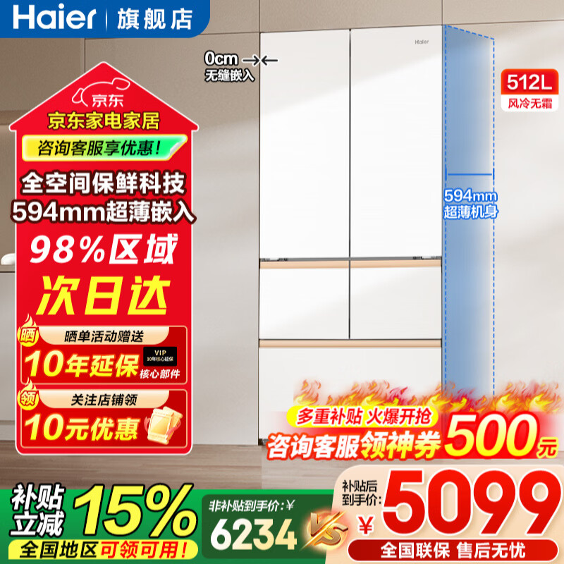 旗舰店海尔(Haier)冰箱512升超薄零嵌入式全空间保鲜法式多门一级能效双变频干湿分储家用大容量电冰箱补贴15% 512升+超薄零嵌入式+全空间保鲜