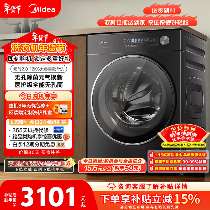 自营美的(Midea)元气2.0 滚筒洗衣机全自动 12KG纯平大容量 1.15洗净比 MG12L5PROMAX 以旧换新 国家补贴 京东自营