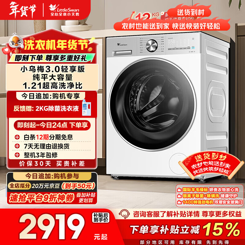 自营小天鹅(LittleSwan)小乌梅3.0轻享版 滚筒洗衣机全自动 12KG纯平大容量 水魔方TG12VE10PRO 以旧换新 国家补贴 内衣洗