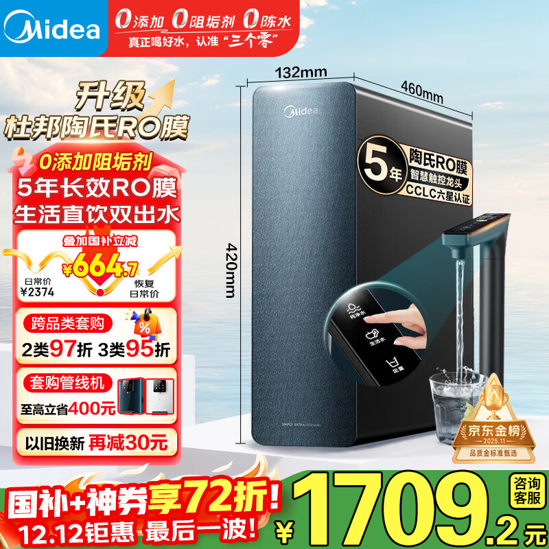 自营美的(Midea)净水器家用星河1000G PRO 5年长效陶氏RO反渗透0阻垢剂直饮机厨下式净饮机国家补贴 鲜活零陈水
