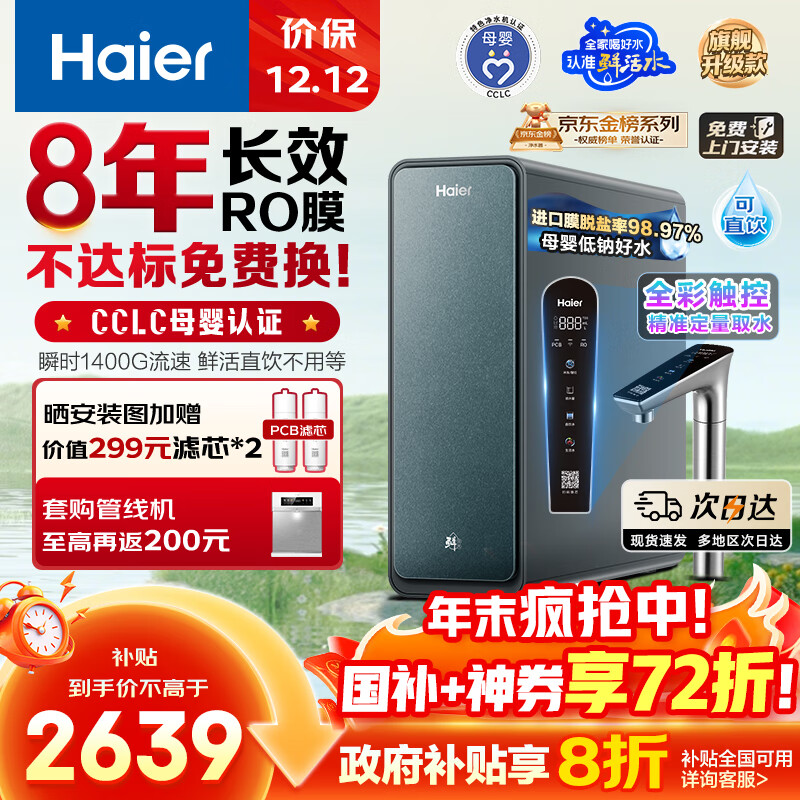 旗舰店【政府补贴】海尔鲜活水PRO1200G净水器厨卫直饮家用净饮机R762