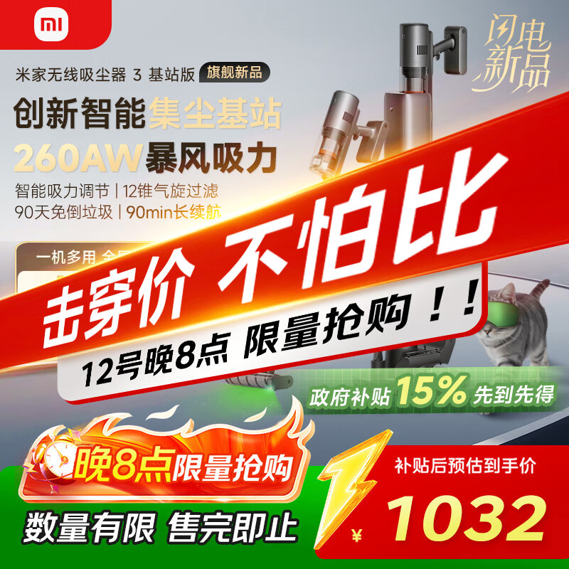 自营米家小米无线吸尘器3 基站版 自集尘大吸力长续航 90天免倒尘 140°绿光显尘 APP智联 吸猫毛狗毛