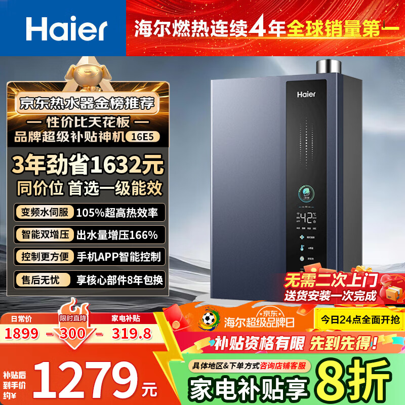 旗舰店[政府补贴]海尔燃气热水器天然气一级能效恒温16L升E5增压家用ER3