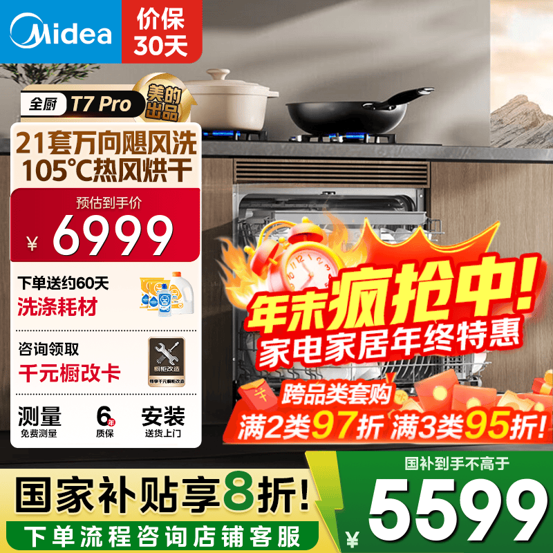 旗舰店美的(Midea)【T7 Pro】嵌入式洗碗机灶下21套高700mm万向飓风喷臂变频四星消毒七星消杀105℃热风烘干单消毒 【国家补贴20%】【免费上门测量尺寸】
