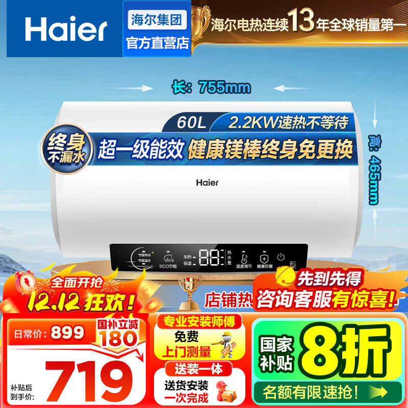 旗舰店海尔(Haier)热水器60升电热水器【咨询客服享补贴20%】镁棒免更换2200W速热 超一级能效家用储水式大水量R3 60L 2200W 【性价比首选热销1000W+】R3