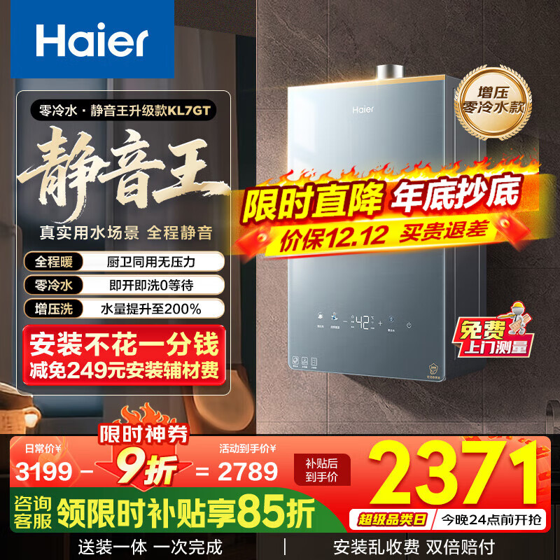 旗舰店海尔(Haier)【静音王KL7pro/KL7GT】燃气热水器天然气AI降噪5A一级恒温增压瀑布洗下置密闭稳燃舱 16L 【KL7GT】静音王零冷水版