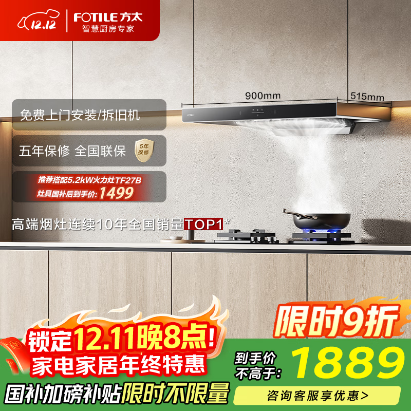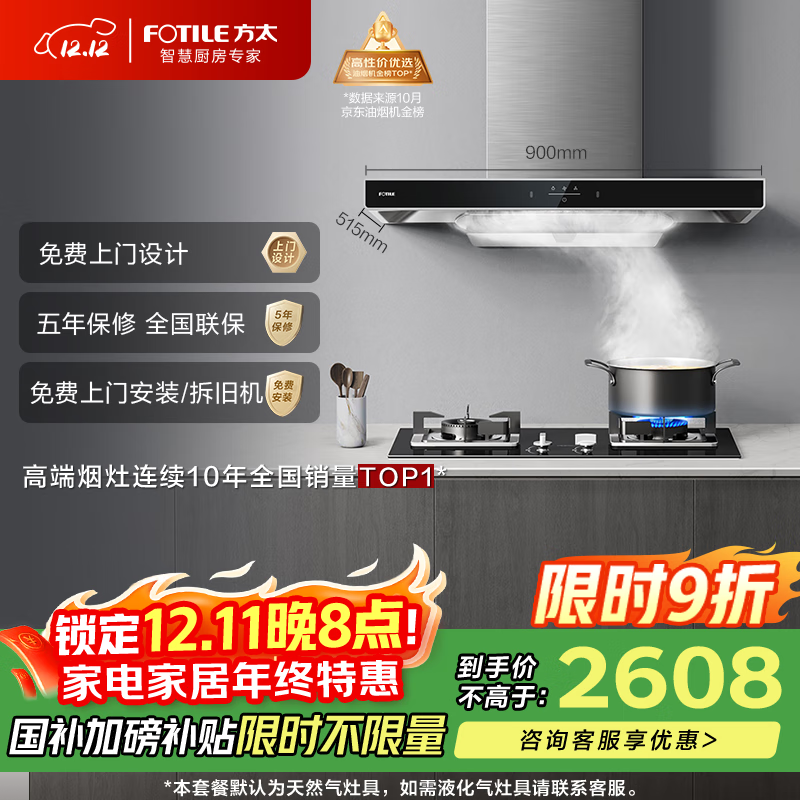 自营方太F5+03-TEK20【主推品质烟灶套装】27风量智感净味抽吸油烟机+定时防干烧升级款天然气灶 以旧换新