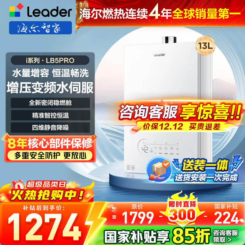 旗舰店海尔(Haier)智家出品Leader统帅燃气热水器【i系列/好梦LB5PRO】天然气水伺服恒温密闭稳燃舱静音家用 13L 【i系列】LB5PRO