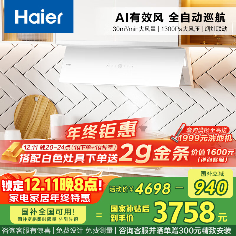自营海尔(Haier)抽油烟机 小红花白色全自动C50max 顶侧双吸外观全自动 30风量吸力烟灶联动936UD【套装商品】