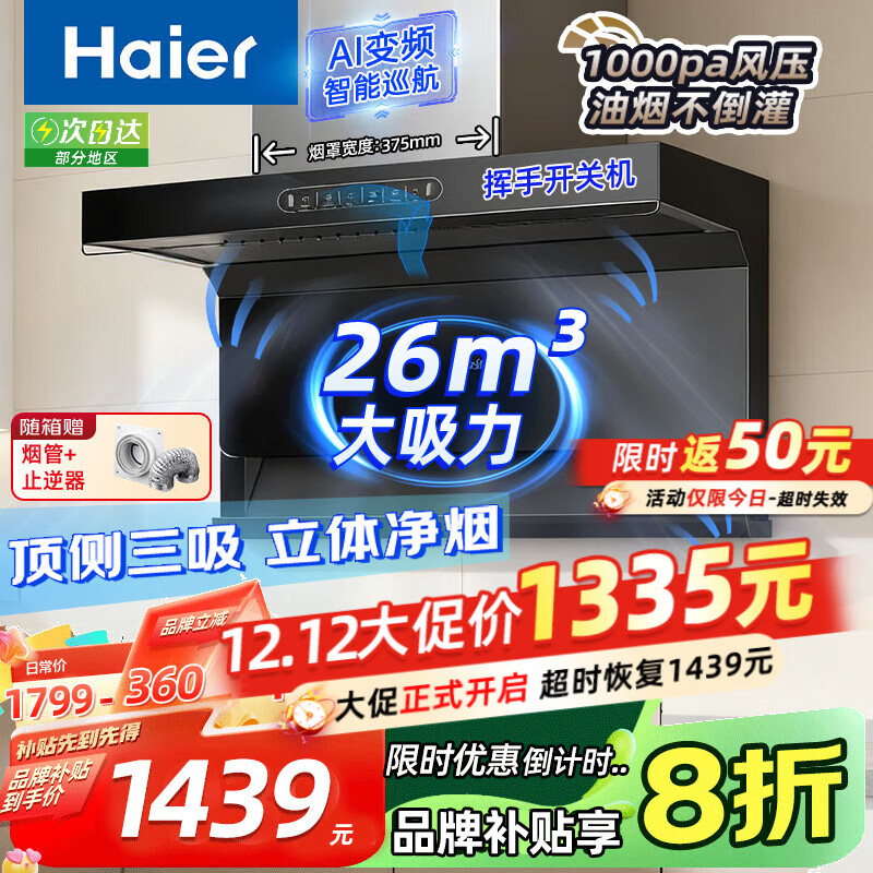 旗舰店海尔【热销中】抽油烟机26立方大吸力家用顶侧双吸 燃气灶 电热水器或燃气套装 静音 统帅Leader系列 【单烟机】26m³大吸力+1000pa静压