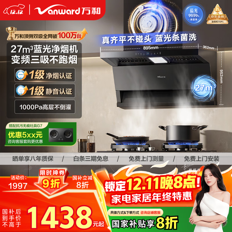 自营万和油烟机【小双翼WL877·蓝光净烟】顶侧双吸抽排27风量变频三吸杀菌家用大吸力以旧换新国家补贴20%