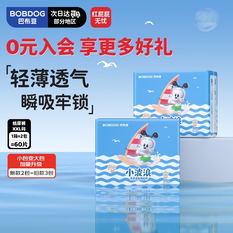 自营巴布豆(BOBDOG)小波浪薄柔亲肤纸尿裤XXL60片(15KG以上)大码婴儿尿不湿柔软透气
