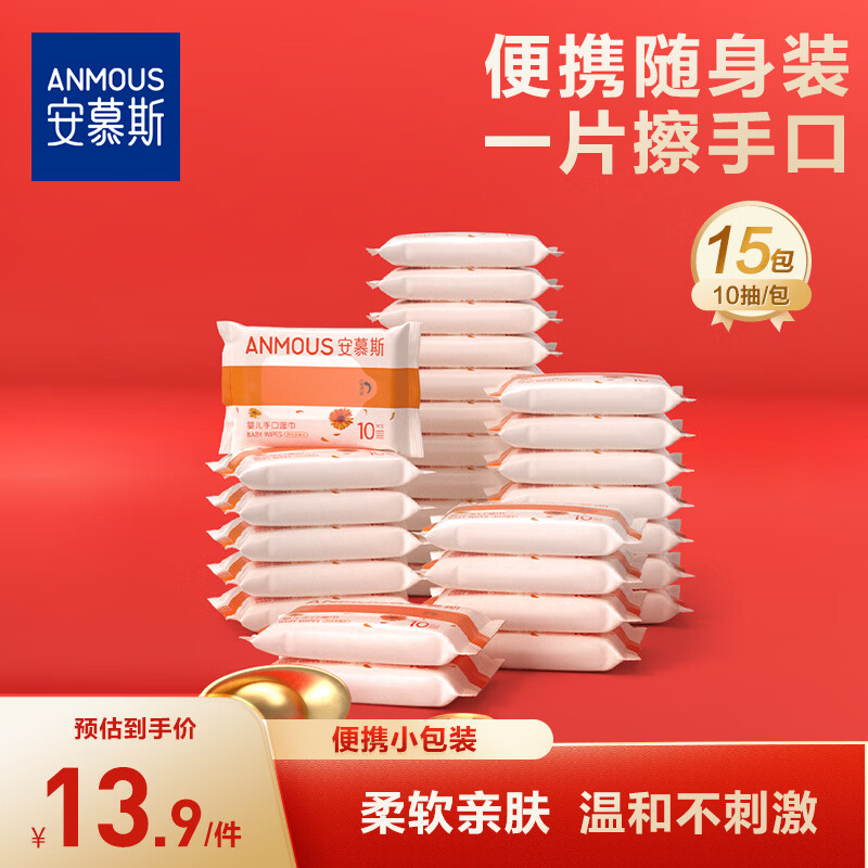 旗舰店安慕斯(Anmous)婴儿湿巾 新生儿宝宝专用口手湿纸巾金盏花便携小包装柔软加厚 金盏花-婴童湿巾 10抽 15包
