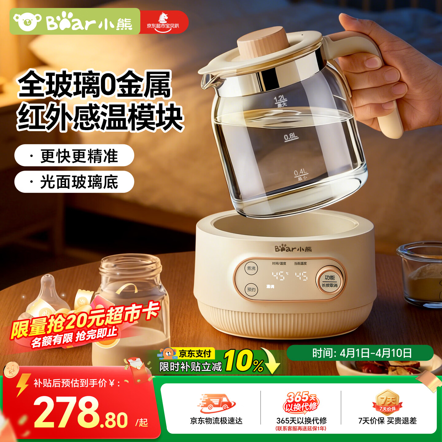 自营小熊(Bear)全玻璃恒温水壶 婴儿调奶器烧水壶热水壶 温奶器 1.2L热门商品