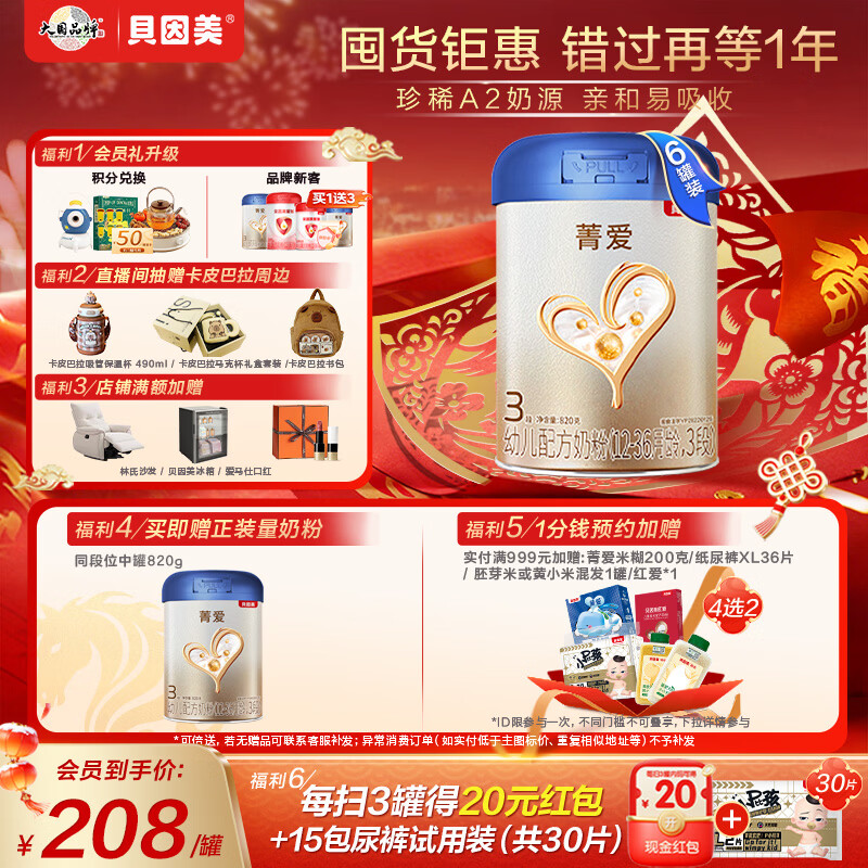 自营贝因美贝因美菁爱A2幼儿奶粉12-36个月3段820g*6 含A2-β酪蛋白