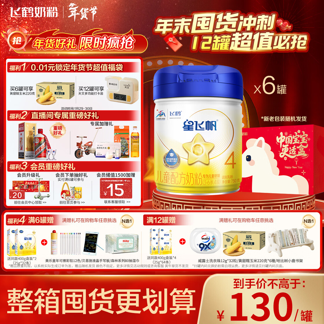 自营飞鹤星飞帆CBP骨骼发育儿童成长奶粉4段(3-6岁)750g*6罐