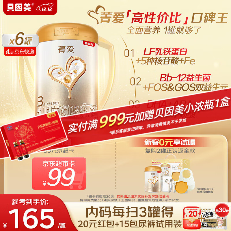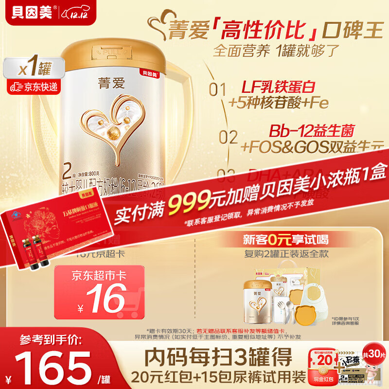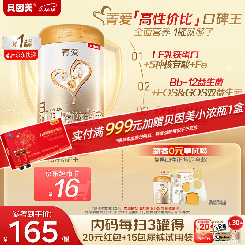 自营贝因美【焕新】菁爱12-36月幼儿配方奶粉3段800g骨骼发育消化吸收益生菌