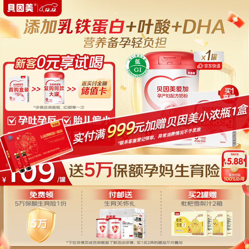 自营贝因美爱加低GI孕妇奶粉大罐700g含乳铁蛋白酵母β-葡聚糖膳食纤维0蔗糖