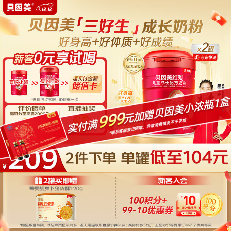 自营贝因美红爱儿童成长奶粉4段700g*2骨骼发育CBP乳钙VD乳铁蛋白3-15岁