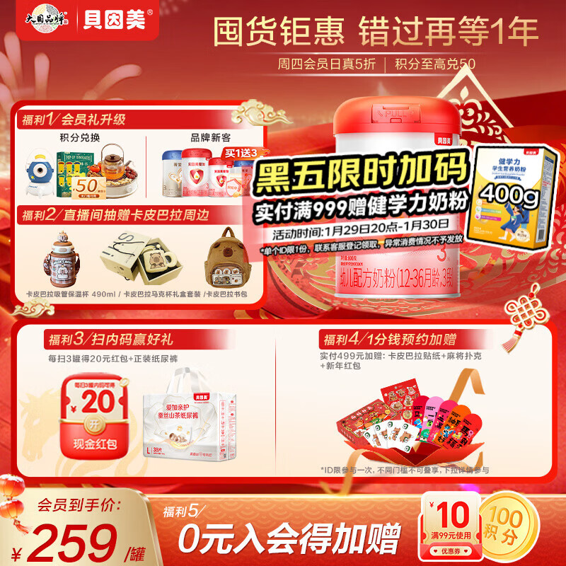 贝因美菁爱幼儿配方奶粉3段800g*6罐DHA乳铁蛋白益生菌全能营养