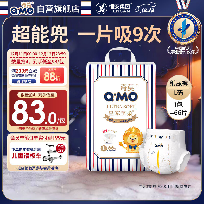 自营奇莫Q-MO皇家至柔纸尿裤L66片(9-14kg)尿不湿大号超薄透气超能吸