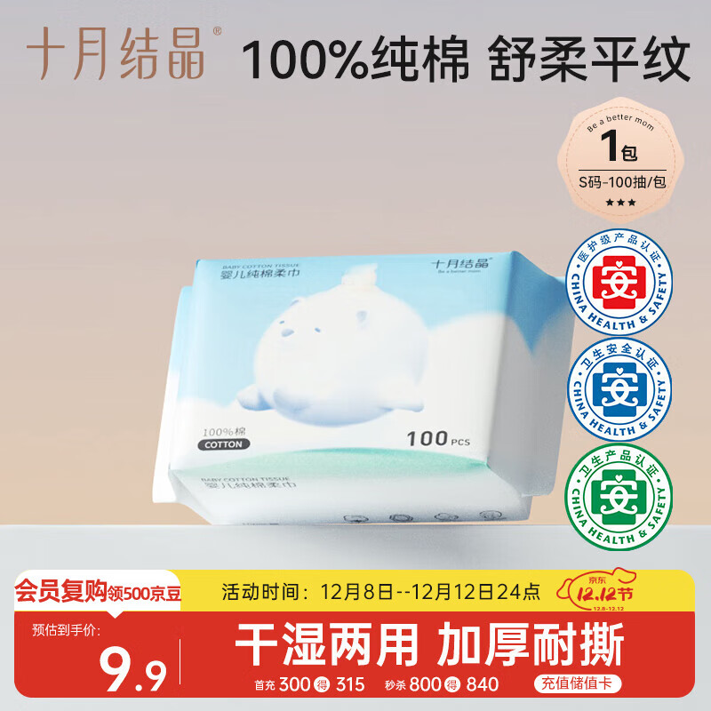 自营十月结晶婴儿棉柔巾 宝宝干湿两用巾纯棉纸巾一次性洗脸巾100抽