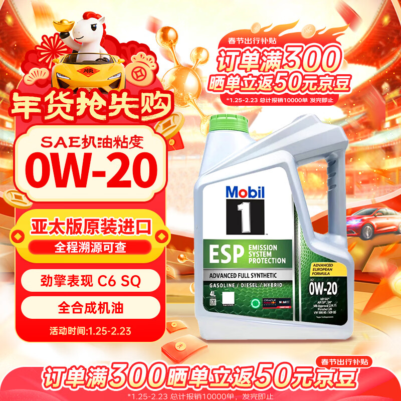 自营美孚(Mobil)1号 全合成机油 劲擎表现 ESP 0W-20 C6 SQ级 4L 新加坡原装进口