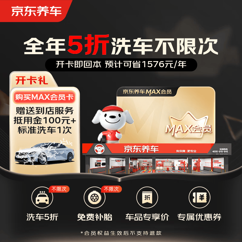 自营京东养车MAX会员年卡全年享8大特权 洗车5折 免费补胎 权益PLUS