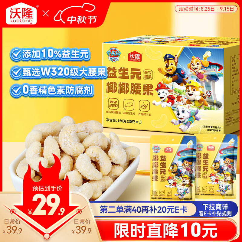 自营沃隆风味腰果150g/5袋益生元椰椰腰果汪汪队联名款儿童休闲小零食