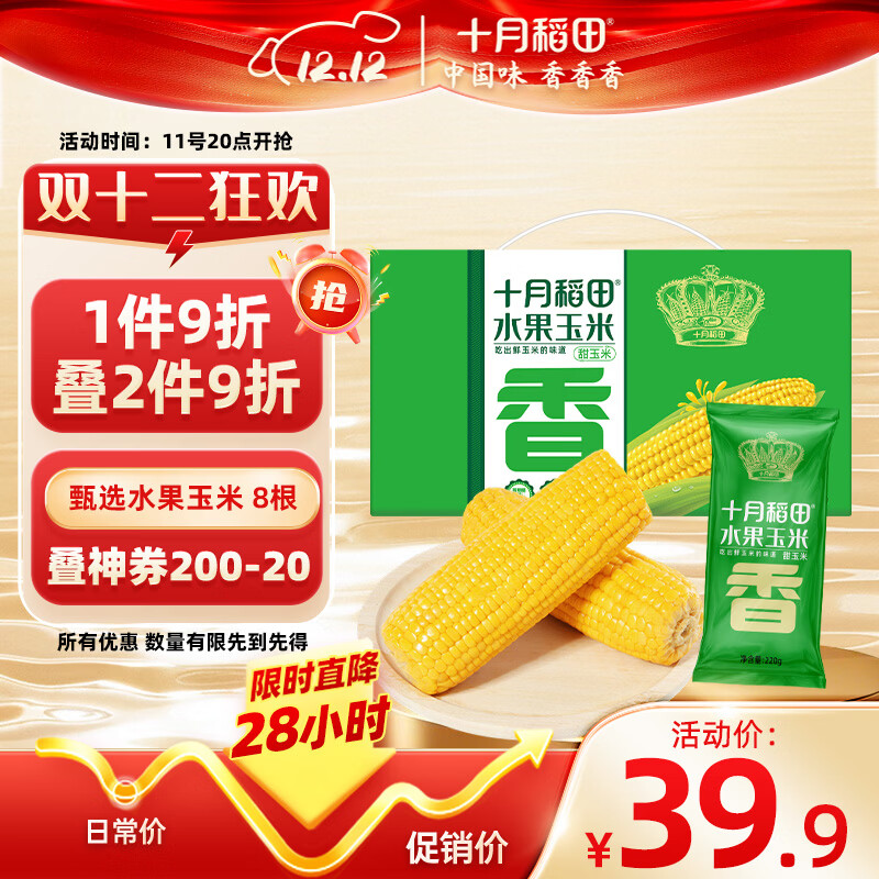 自营十月稻田 水果甜玉米 8根 3.52斤 真空开袋即食 低脂早餐 粗粮礼盒