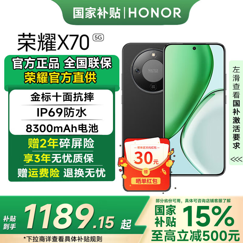 旗舰店荣耀X70 【国家补贴立减15%】新品5G 手机 金标十面抗摔 80W无线超级快 AI拍照键 OLED护眼屏 超轻薄 幻夜黑 8GB+128GB【2年碎屏险+3年质保】